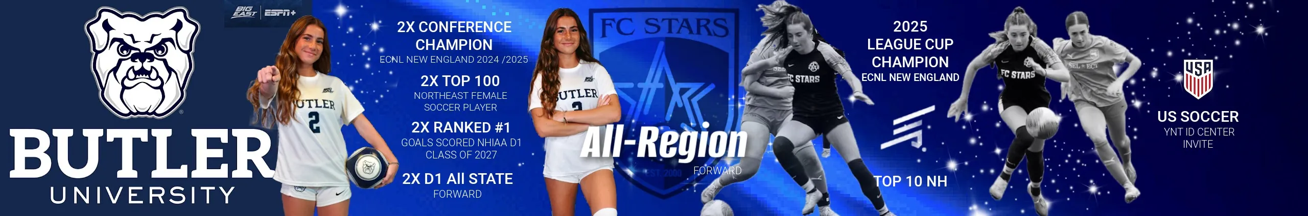 Elle Lavalliere (Class of 2027) is committed to Butler University in Indianapolis, IN. A powerful left-footed attacker, she consistently separates from defenders and is an efficient finisher. Her honors include All-Region, Top 10 New Hampshire, 2x ECNL NE Champion, League Cup Champion, 2x Top 100 Player (NE), 2x Division I All-State Forward, Goffstown HS MVP, 2x Most Points Award winner, 3x ECNL National Playoff Qualifier, and a U.S. Youth National Team ID invite. Elle plays attack for FC Stars ECNL Blue 09 and the D1 Goffstown Grizzlies. She ranked #1 in goals scored for the Class of 2027 during both her sophomore and junior seasons. As a junior, she tallied 25 goals and 10 assists (60 points), bringing her career total to 125 points. She helped lead Goffstown to back-to-back 5th-seed conference finishes—the highest in program history. Dangerous in transition, Elle excels in hold-up play, 1v1 situations, shooting from range, and delivering quality service.