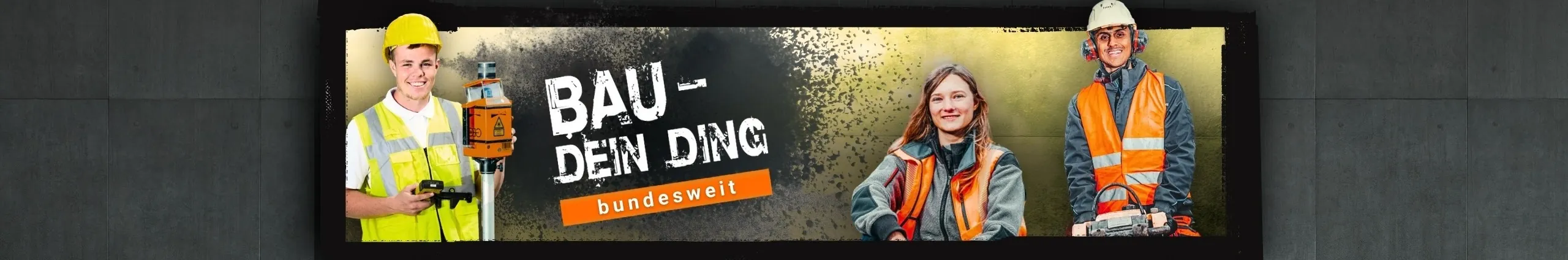 Die Kampagne „BAU - DEIN DING" hat das Ziel, dem Fachkräftemangel im Baugewerbe aktiv entgegenzuwirken. Unsere offensive Werbung für die vielseitigen Berufe des Bauhaupt- sowie Ausbaugewerbes richtet sich insbesondere an Schüler ab der 7. Klasse, die eine Haupt-, Werkreal- oder Realschule besuchen. Wir möchten den jungen Menschen verdeutlichen, dass ihnen eine Berufsausbildung in der Bauwirtschaft interessante Karrieremöglichkeiten und eine sichere Zukunftsperspektive bietet. Impressum: https://www.bau-dein-ding.de/bundesweit-de/service/impressum