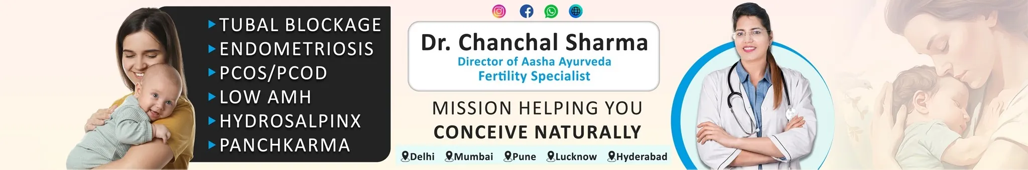 Guided by the belief that every couple deserves the joy of parenthood, Dr. Chanchal Sharma- India’s trusted Ayurvedic fertility expert helps couples struggling with infertility. She has established a strong presence in Delhi, Mumbai, Pune, Hyderabad & Lucknow. With a strong academic foundation (BAMS- Tibbiya College, DU, MD Ayurveda, and MSc Biotechnology- NIMS Jaipur) & a certified qualification in Ayurvedic Gynecology & Obstetrics from Mumbai, Certificate in Clinical Panchkarma from Kopergoan, Maharashtra. She has received prestigious honors: Vaidya Raj Gogate Smriti Puraskar & Matricharya Icon Award. ☛ Tubal blockage treatment ☛ Natural conception guidance ☛ PCOD / PCOS treatment tips ☛ Endometriosis management ☛ Low AMH treatment ☛ Panchakarma therapies ☛ Real patient success stories Why thousands trust Dr. Chanchal Sharma: 15+ years of experience 90% success rate Personalized fertility plans