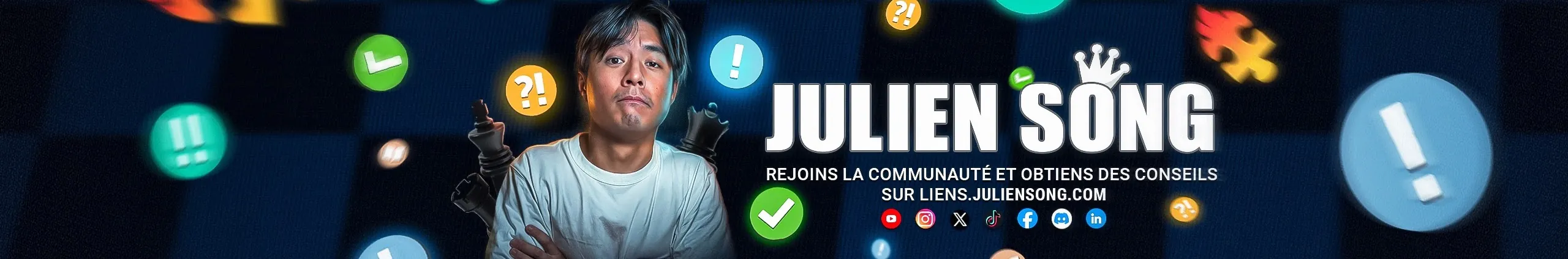 🏆 Hello, c'est Julien ! Je suis Maître International d'échecs. 👉 Rejoins la communauté et obtiens des conseils pour progresser aux échecs sur https://liens.juliensong.com ! 📩 Contact pro : [email protected]
