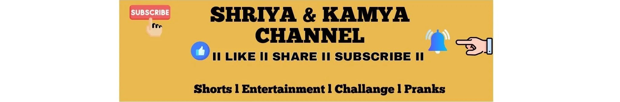 Hello Everyone ! Welcome to our channel , My name is Shriya Joshi & this channel loves to entertain and makes other smile. This channel provides you with variety content such as challenge, prank ,comedy & shorts. Hope you will enjoy !! This channel is created by best friends Shriya & kamya Only For Fun . DONT FORGET TO SUBSCRIBE AND HIT THE BELL ICON βΊοΈ & KEEP SMILING π