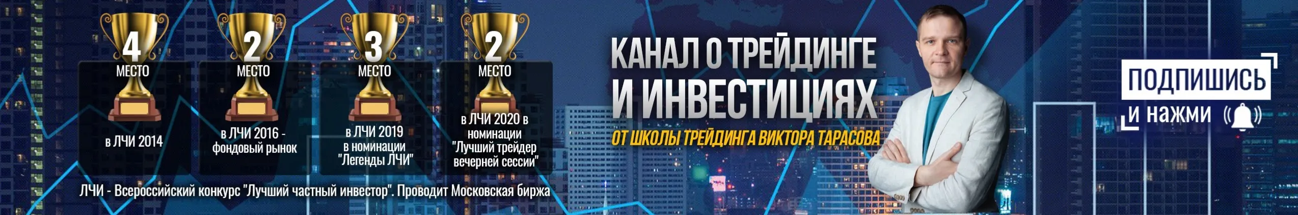 Меня зовут Виктор Тарасов. Мой канал посвящен людям, которым интересен качественный трейдинг и грамотные инвестиции. Здесь я делюсь собственным опытом в торговле на бирже и в сфере инвестирования. Рассказываю полезные фишки при спекуляции акциями, фьючерсами и валютой. А так же показываю надежные инструменты для сохранения и приумножения собственного капитала. ОБО МНЕ - Профессиональный трейдер с общим стажем 20 лет. - С 2016г преподаватель Московской биржи. - Консультант ViP клиентов ведущих банков России в области инвестирования денежных средств. - 4 место конкурсе "Лучший частный инвестор" в номинации фондовый рынок в 2014 году. - 2 место конкурсе "Лучший частный инвестор" в номинации фондовый рынок в 2016 году с доходностью чуть менее 500%. - Разработал собственную систему безубыточной торговли, основанную на технико-психологическом анализе. - Мастер спорта по шашкам, занял второе место на чемпионата мира 1993г. - Отец троих детей.