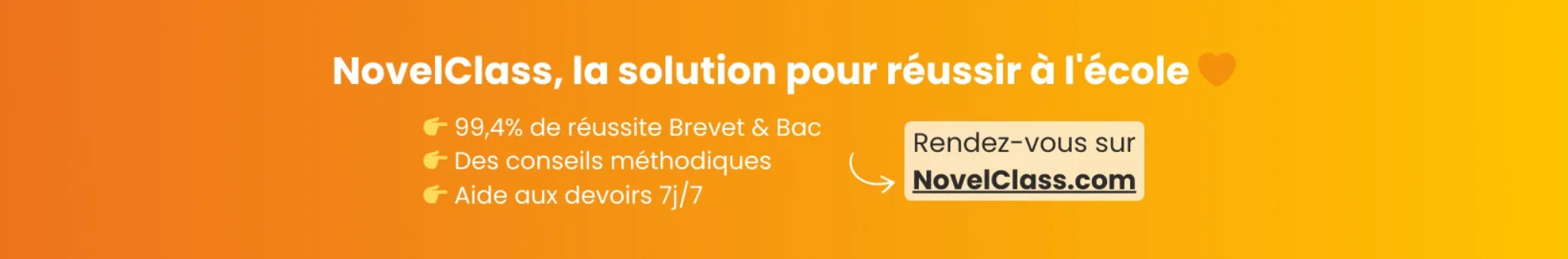 NovelClass, la solution pour réussir à l'école 🧡 👉 99,4% de réussite Brevet & Bac 👉 Des conseils méthodiques 👉 Aide aux devoirs 7j/7 Historique : 03 Septembre 2019 : 1'392 vues, 30 abonnés 10 Décembre 2019 : 6'934 vues, 194 abonnés 21 Avril 2020 : 116k vues - 3,1k abonnés 29 Jan. 2021 : 1,45M vues - 27,6k abonnés 23 Déc. 2021 : 4,00M vues - 51,5k abonnés 26 Jan. 2024 : 10,6M vues - 100k abonnés NovelClass est une référence du soutien scolaire en ligne (noté 4,8/5 par +8400 avis) !