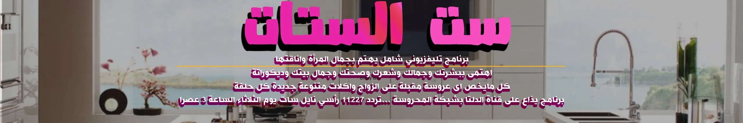برنامج تليفزيوني شامل يهتم بجمال المرأة واناقتها ...... 1- تعليم الطبخ ووصفات الاكل المختلفه 2- الكتير من المخبوزات والفطائر من بلدان مختلفه منها الحلو والحادق 3- وصفات طبخ مصريه وعربيه والتى تصلح كوجبات للغذاء والعزومات 4- انواع مختلفه من المهلبيات والايس كريم والعصائر والمشروبات الساخنه 5- تعليم طريقه تخزين الخضروات والفاكهه والاستفاده منها فى اوقات عدم توفرها 6-عرض طريقه تزين الخضروات والفاكهه ( الجارنيش ) من اجل تزين الاطباق الرئيسيه وجذب الافراد لناول الوجبات 7-اعاده تصنيع الاشياء الغير مستخدهه والاستفاده منها بصناعه ادوات تفيد المطبخ وباقل تكلفه 8-اهتمى ببشرتك وجمالك وشعرك وصحتك وجمال بيتك و ديكوراتة 9- اعداد العديد من انواع الفطائر والمخبوزات بدون فرن والبيتزات المختلفه 10- طهى انواع كتيره من اطباق اللحوم والدواجن والاسماك 11-كل مايخص اى عروسة مقبلة على الزواج 12- وصفات الجمال وتحضير الوصفات المفيده للعنايه بالبشره و الشعر قناة الدلتا ...تردد 11227 رأسي نايل سات يوم الثلاثاء الساعة 3 pm الفايس بوك رابط الصفحة :https://www.facebook.com/SetelSetatTv/
