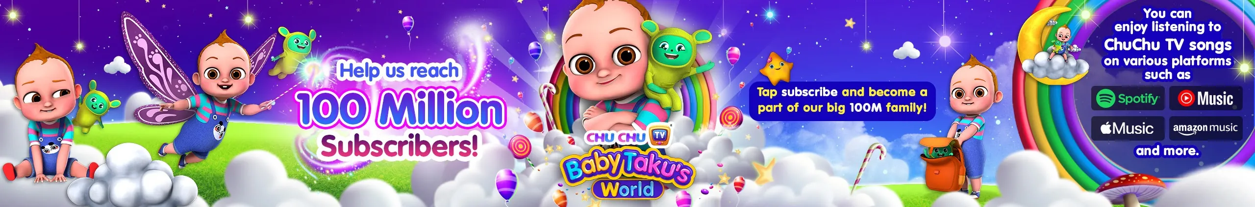 Join Baby Taku and friends for fun adventures as they explore ABCs, colors, numbers, and more. Let’s play and learn together! ChuChu TV's Toddler Learning Videos are designed to engage kids with fun nursery rhymes and educational songs featuring colorful animations. Our team includes moms and dads of young children, experts in early childhood education, writers, artists, animators and musicians.. We have a global team of creatives to ensure culturally-relevant content for children worldwide. Find ChuChu TV on Amazon Prime Video, Roku, Kiddoodle, and ChuChu TV Pro App. Listen to ChuChu TV songs anytime, anywhere on Spotify, Apple Music, Amazon Music, YouTube Music and more Enjoy with your little ones!