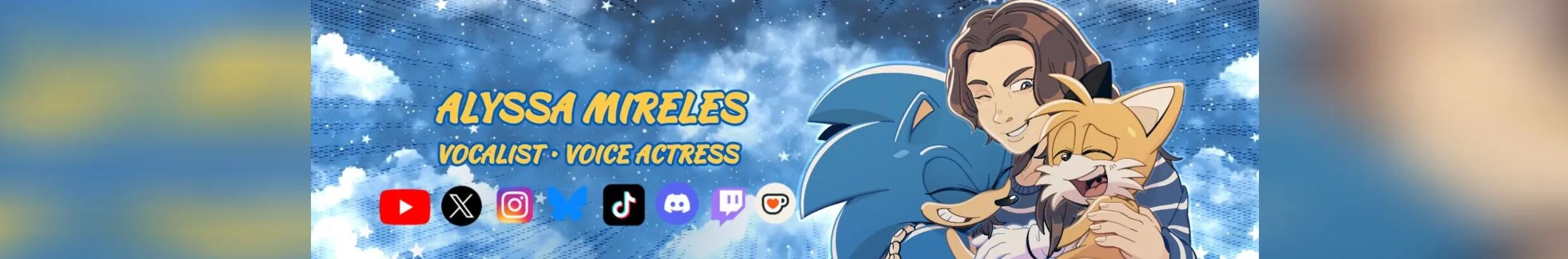 Hello ! I am a Vocalist and a Voice Actress! I love to create Sonic The Hedgehog related videos. Whether it'd be for Voice Impressions, Song Covers, Comic dubs, and more! I hope you guys would enjoy my Channel! Banner made by my good friend ThatTailsGuy aka Nic Kenten! Thank you for being supportive! Love, Alyssa Mireles 💙💛❤️