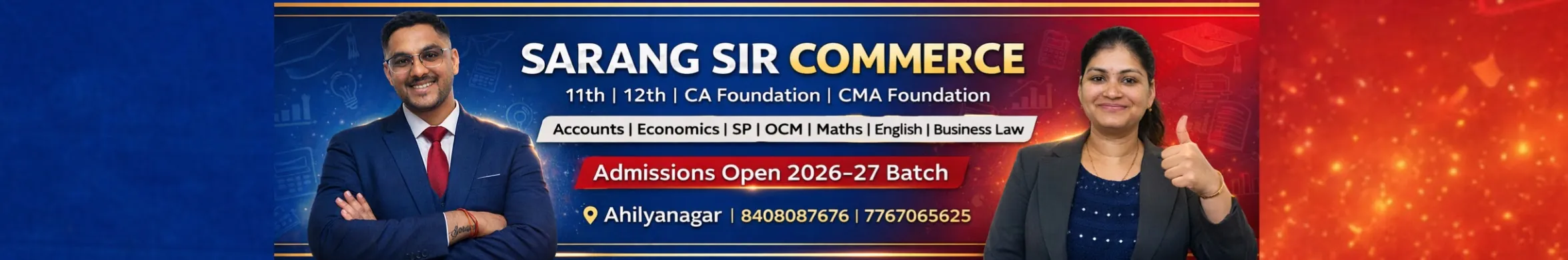 Welcome to Sarang Sir Commerce π β Your trusted platform for 11th & 12th Commerce, CA Foundation & CMA Foundation preparation. We provide complete guidance for Maharashtra Board 11th & 12th Commerce with strong conceptual clarity and exam-focused teaching. Founded in 2017, Sarang Gujarathiβs Commerce Academy (SGCA) is committed to building academic excellence, confidence, discipline, and career clarity in every student. Learn from experienced educators: π¨βπ« CS Sarang Gujarathi (CS, DTL, CA Final, M.Com) π©βπ« CA Preeti Gujarathi (Chartered Accountant, B.Com) π Our Academy Address: SARANG GUJARATHI's COMMERCE ACADEMY Balikashram Rd, Opposite New Arts College Back Gate, Sudke Mala, Ahilyanagar, Maharashtra β 414001 Branch: Vaidya Colony, J K Road, Ahilyanagar π Contact / WhatsApp: 8408087676 8408083737 Subscribe to Sarang Sir Commerce and build your strong foundation for HSC, CA & CMA success π