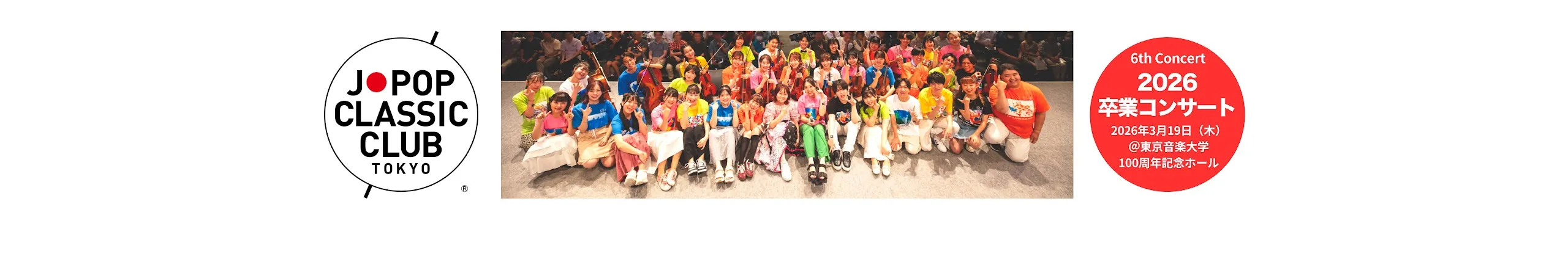 【2026卒業コンサート開催決定!】 ★先着順/チケット一般発売中/チケット残りわずか★ 申込はこちら⇒https://linktr.ee/jpopclassic 「イープラス」「ローチケ」「ぴあ」 ■公演: 6th Concert「2026卒業コンサート」 ■日時: 2026年3月19日(木)開場17:30/開演18:00 ■チケット: ●プレミアムシート ¥8,500(税込)最前列から7列目以内 ※完売御礼※ ●一般指定席 ¥6,800(税込)※完売御礼※ ●バルコニー席 ¥4,000(税込)※ステージサイドのお席のため、ステージの一部が見えづらいことをご了承の上、お買い求めください ※残りわずか※ ※4歳以上有料 3歳以下入場不可 ■場所: 100周年記念ホール(東京音楽大学 池袋キャンパス内) 東京都豊島区南池袋3-4-5 【J-POP CLASSIC CLUB TOKYO】は、東京音楽大学に学ぶ声楽、弦楽器、打楽器、ピアノ、作曲の各専攻の学生有志が集まって結成された楽団です。 親世代が青春時代、夢中で聞いていた曲たちは時を超え、素敵なメロディとして私たちの心をとらえます。昭和平成の大ヒット曲を、オーケストラに編曲して、歌って演奏します。 中高年の人には懐かしく、若者には新鮮な名曲の数々を、リスペクトの気持ちを込めて演奏します。小さい頃からクラシックを学んできましたが、実はPOPSも大好きです。 POPSの表現方法を学びながら演奏しています。「POPSとクラシックの融合」を合い言葉に、「圧倒的な演奏」を目指して活動しています。 ★今までに公開した主な曲です ●瑠璃色の地球 ●銀河鉄道999 ●未来予想図Ⅱ ●ラブ・ストーリーは突然に ●なごり雪 ●時代 ●春一番 ●TOMORROW ●クリスマス・イブ ●家に帰ろう ●少年時代 ●タッチ ●中央フリーウェイ ●赤いスイートピー ●希望の轍 ●幸せな結末 ●卒業写真 ●手紙 〜拝啓 十五の君へ〜 ●アメリカン・フィーリング ●September ●埠頭を渡る風 ●世界でいちばん熱い夏 ●う、ふ、ふ、ふ、 ●空と君のあいだに ●遠く遠く ●かもめが翔んだ日 ●涙のリクエスト ●異邦人 ●浪漫飛行 ◼︎お問い合わせ、演奏のご依頼はこちら [email protected]