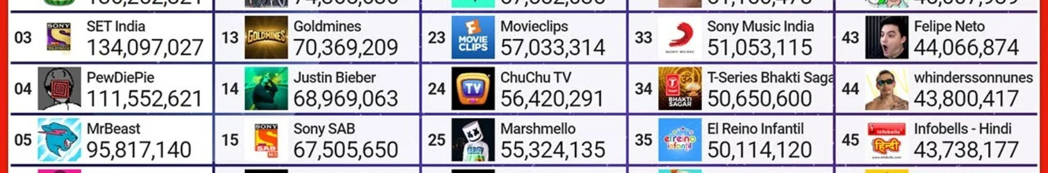 Hello, welcome to my official YouTube channel! I am a big fan from MDM so I decided to make stats shorts from it. My goal is to reach 1K subscribers by the end of 2026. I sometimes upload videos at the wrong time especially when I'm very busy, so I apologize. Channels I include (if possible): #: 5-Minute Crafts A: A4, Alan's Universe, Alejo Igoa, Ariana Grande B: BANGTANGTV, Billie Eilish, BLACKPINK C: Celine Dept D: Dude Perfect E: Ed Sheeran G: Goldmines I: IShowSpeed, ISSEI J: Justin Bieber K: KIMPRO M: Mark Rober, Movieclips, MrBeast, MrBeast 2, MrBeast Gaming P: PANDA BOI, PewDiePie S: SET India, Sony SAB, Stokes Twins T: Taylor Swift, Topper Guild, T-Series U: UR • Cristiano W: WWE Z: Zee Music Company, Zee TV, Zhong Channels I don't include: Kids channels and channels that I don't care (unless they hit massive milestones like 100M, 200M, 300M, etc).