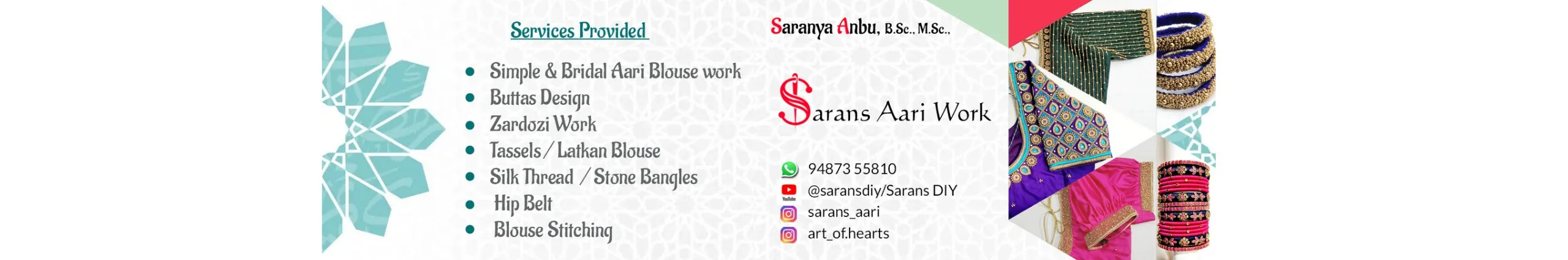 Hi..I'm Saranya welcome to my YouTube channel Saran's DIY Easy Aari tutorials with step-by-step explanation in Tamil Whatsapp : 9487355810 Instagram aari ID - sarans_aari Link - https://instagram.com/sarans_aari?igshid=YmMyMTA2M2Y= Instagram art ID - art_of.hearts Link - https://instagram.com/art_of.hearts?igshid=YmMyMTA2M2Y=