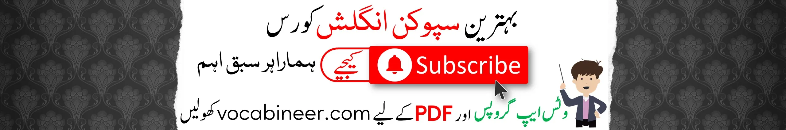 Vocabineer is an English learning channel that can help you learning English Vocabulary, English Grammar, English Speaking, Accent and pronunciation using Hindi and Urdu language.