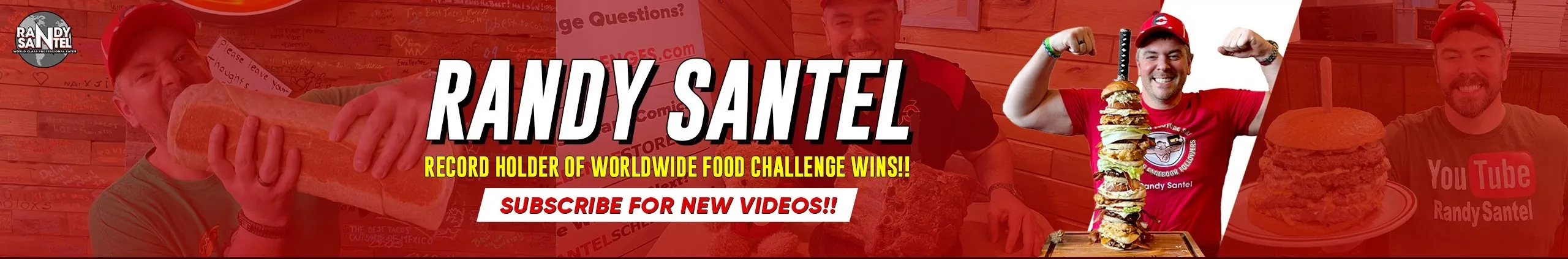 Welcome to Randy Santel's YouTube Channel!! I am a professional eater living in Nashville, Tennessee, originally from St Louis, Missouri in the USA, who focuses strictly on winning and promoting restaurant food challenges all around the world!! I currently have wins in all 50 states and 44 countries, and won't be stopping anytime soon!! I focus heavily on nutrition and also on fitness so I'm able to stay lean while winning over 50 challenges per year. I have the most food challenge wins out of all eaters (past and present) around the world and the gap will only grow larger. I own and operate FoodChallenges.com which includes a full database of all current restaurant eating challenges available in over 50 countries around the world along with over 100 articles teaching people how to train, strategize, and dominate them all. We post new eating videos every Monday, so please subscribe to stay updated!! Please check out our store and get your own FoodChallenges.com gear!!