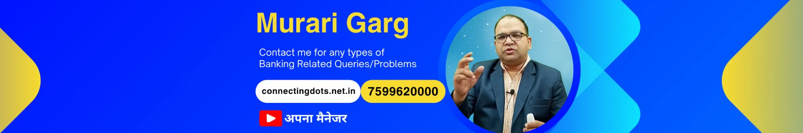 Dear Sir, I am Ex- SBI Employee, with my 10 years banking experience in State Bank of India, i have created this channel. Many people face problem due to lack of banking knowledge. I have tried to fill that gap with my knowledge and experience. Here you will get solutions of all problem related to general banking. Thanks Murari Garg Connecting Dots Finserve Pvt. Ltd. G2, 174 Sumer Nagar I, Mansarovar Extension, Jaipur