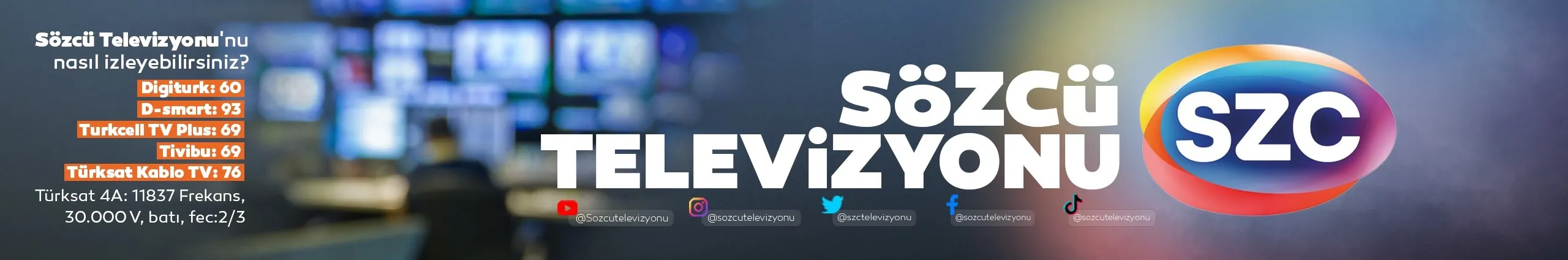 Sözcü Televizyonu'nu nasıl izleyebilirsiniz? Digiturk: 60 D-smart: 93 Turkcell TV Plus: 69 Tivibu: 69 Türksat Kablo TV: 76 Türksat 4A: 11837 Frekans, 30.000 V, batı, fec:2/3
