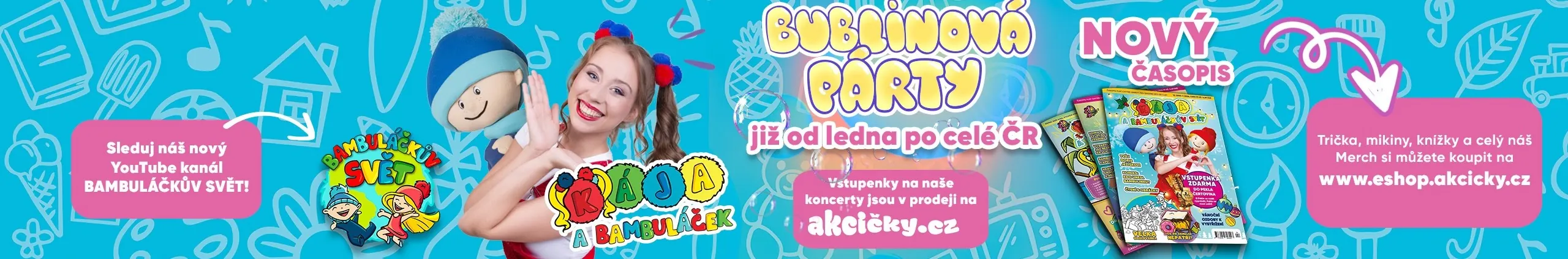 Ahoj! My jsme Kája a Bambuláček. Kamarádská culíkatá holka a malý zlobivý kluk s modrou bambulí, který pochází z malé vesničky jménem Bambulkov. Z vesničky, která leží uprostřed lesa. Od té doby, co jsme se poznali, jsme nerozlučná dvojka, která společně s dětmi ve svých videích na YouTube kanále Kája a Bambuláček prožívá spoustu bláznivých dobrodružství. Hrajeme si, tancujeme, zpíváme, poznáváme svět a se svojí vlastní hudební šou koncertujeme po celé České republice. I ty se na nás můžeš přijít podívat a užít si tak spoustu legrace. Tak co, přijdeš? :)