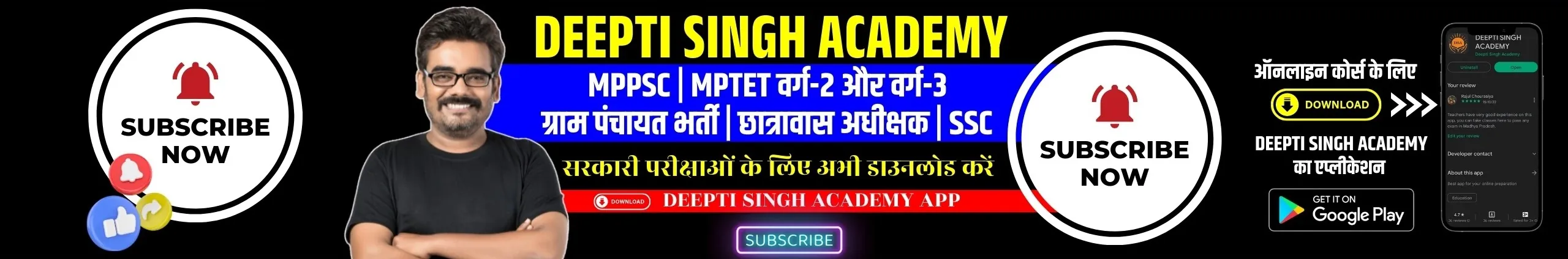 🙏Welcome to 'Deepti Singh Academy, Indore' YouTube Channel by Dinesh Thakur Sir, an experienced educator and Director. Dinesh Sir expertise in education and MPGK shapes our institution's. He provides insights into training, leadership development, and curriculum reform, contributing to excellence. 📚Courses for Government Exams MPPSC, Vyapam, MP Chhatrawas Adhikshak(Hostel Superintendent), MPSI, Police, Bank PO/Clerk, SSC, Railway, and all other Competitive Exams. Download 'Deepti Singh Academy' App or visit our website. 👉For more- 📞Call- 9522237038, 9522289892 📌or visit Deepti Singh Academy, Near Chitawad, Teen Imali Squre, Indore (MP)