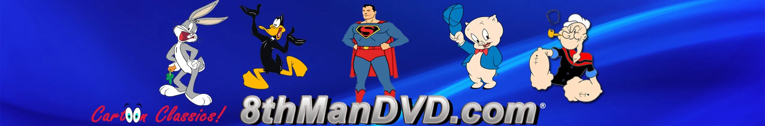 The Official 8thManDVD.com® Cartoon Channel features newly remastered & restored copyrighted cartoons, classic TV Shows and movies such as: Looney Tunes (Looney Toons), Bugs Bunny, Daffy Duck, Porky Pig, Popeye the Sailor, Christmas Classics, The Three Stooges, Tobor the 8th Man and more from our library. Many of which are also available from us on Amazon. 8thManDVD.com® and all content © 2008-2017 ComedyMX LLC. All rights reserved. Unauthorized use is prohibited.