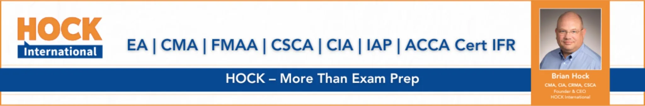 HOCK International provides membership-based professional learning for accounting, finance, and tax professionals. Our memberships integrate: • Certification exam preparation (CMA, CIA, EA, CSCA, FMAA, Cert IFR) • Professional development courses • Study tools and AI support • A global learning community We support both individual professionals and institutional partners worldwide. Founded by Brian Hock, HOCK is committed to helping professionals succeed not only on their exams, but in their careers.