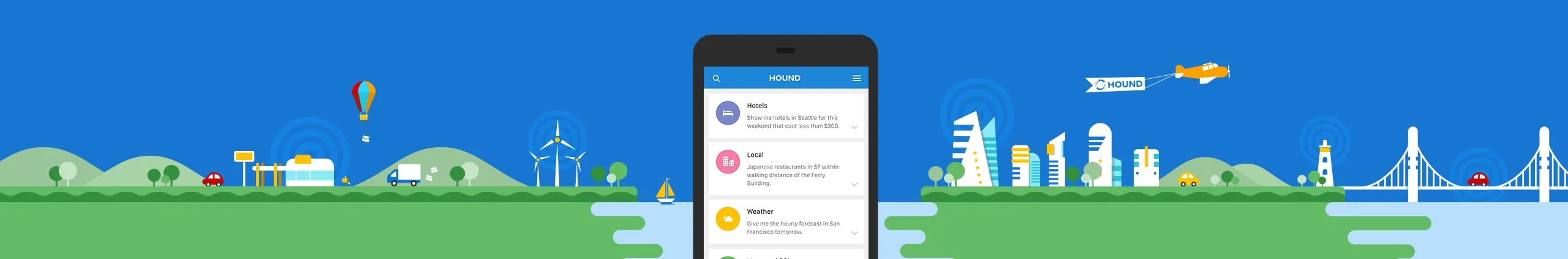 Hound is a hands free way to quickly and intuitively get what you want. It’s your go-to-app that helps you get more done, instantly. Hound is an app that you speak to, and it understands what you are looking for or trying to do. It’s like a voice-enabled search engine. It’s also like a personal assistant. Being the fastest and easiest way to get the information, entertainment, and communication services you want, Hound is built for a hands-free world, from the ground up. You will find yourself opening Hound to do what you used to type and tap for, because now you can simply Hound and get it faster. Hound is a verb, not a personality.
