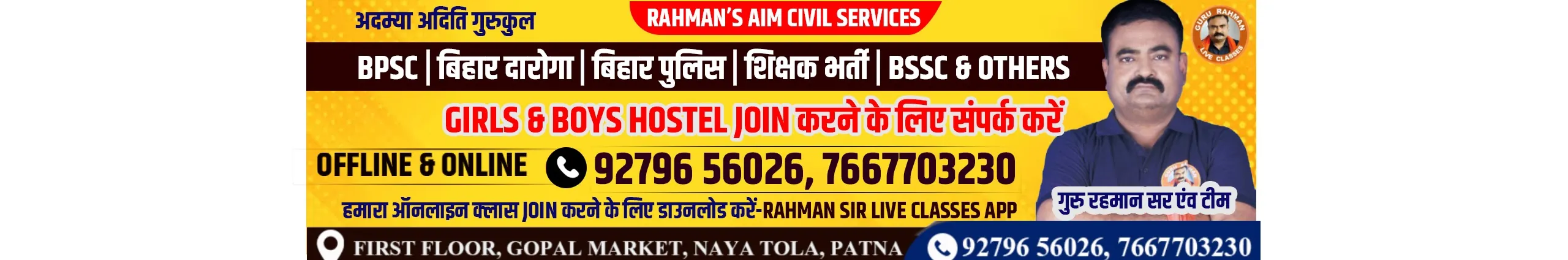 Rahman's Aim Civil Services For: UPSC/PCS(PT/M) Also For : SSC (PT/MAINS)/Railway/DEFENCE/CPO/CPF BY- GURU RAHMAN SIR & TEAM उड़ता वही है जो फड़फड़ाता है ..... - गुरु रहमान VENUE :- Gopal Market, 1st Floor, Naya Tola, Patna-4 OR, 4th Floor Of Central Bank Of India Building, Naya Tola, Patna-4 Mob.: ⭐⭐ For Online Support Contact number :- 7667703230 and 9934402772