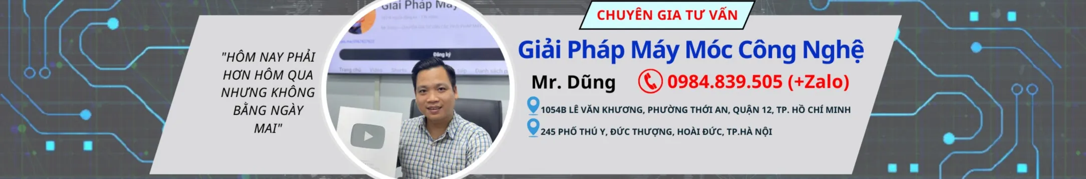 Hotline: 0984.839.505 +(zalo) Mr. Dũng - CHUYÊN GIA TƯ VẤN CÁC PHẢI PHÁP MÁY MÓC CÔNG NGHỆ ---------------------------------- Địa chỉ 1 : Số 245 Phố Thú Y - Đức Thượng - Hoài Đức - Hà Nội. Địa chỉ 2: 1054B Lê Văn Khương, Phường Thới An, Quận 12, TP. Hồ Chí Minh.