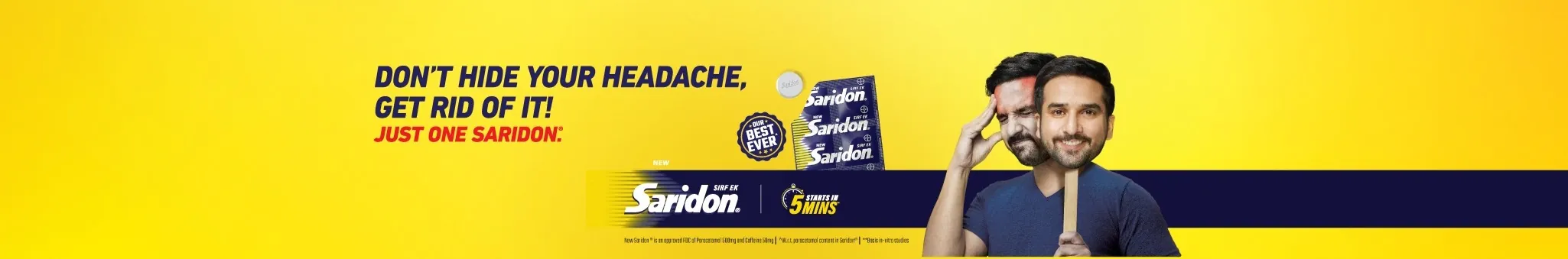 Saridon starts working in 5 minutes after consumption, due to its unique triple action formula. Sirf ek Saridon, aur sardard se aaraam! If you want to report a side effect or quality complaint, please contact your healthcare professional (e.g., physician pr pharmacist). Reports can also be directed to: https://www.safetrack-public.bayer.com OR [email protected] OR https://www.bayer.in/en/thisisbayer/contact-us