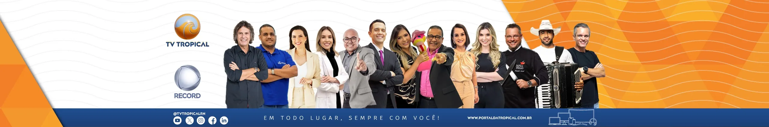 Afiliada Record no Rio Grande do Norte. A Maior Emissora de Televisão do Rio Grande do Norte. Instagram: https://instagram.com/tvtropicalrn Fale com a TV Tropical no ZAP (84) 98104-2824, ou ligue para nossa redação no (84) 3204-6412. #TVTropicalRN #oRNemPRIMEIROlugar #GenuinamentePotiguar #PaixãoEmComunicar Confira nossa Programação Local: Segunda a Sexta: 6h30 - Balanço Geral Manhã com Alanzinho do Povo 08h00 - RN no Ar com Mara Godeiro 11h50 - Balanço Geral RN com Cyro Robson Papinha 14h15 - Tudo com Priscilla Freire 18h00 - Cidade Alerta RN com Murilo Meireles Sábado: 12h00 - Balanço Geral RN Edição de Sábado com Alanzinho do Povo 13h30 - Sabadão Tropical com Priscilla Freire 14h30 - Repórter Aventura com Tiago Medeiros Domingo: 8h00 - No Campo com o Vaqueiro com Edyr Vaqueiro 8h30 - Nordeste das Histórias com Alanzinho do Povo 10h00 - Papo de Fogão com Fernando Amaral 10h30 - Mundo dos Negócios com Jener Tinoco