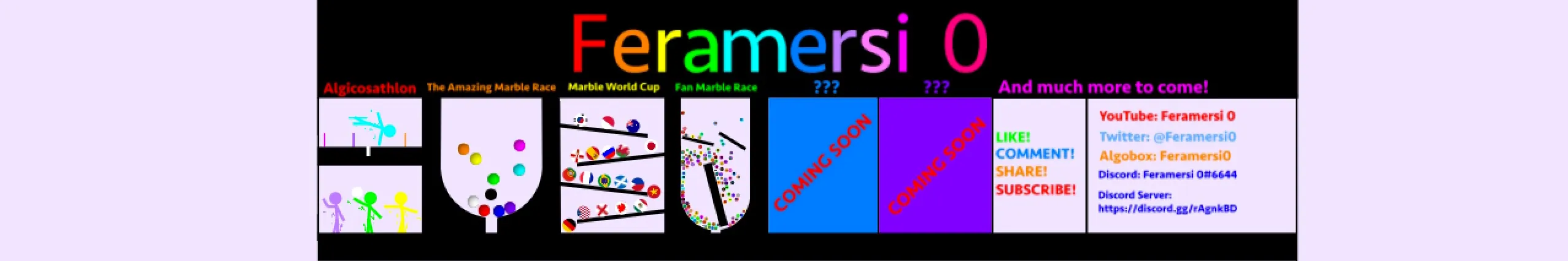 Hi! I am Feramersi 0 and I am that guy who makes intense marble races, algicosathlons, fan competitions and much more! If you are interested in any of this or want to be in another edition of a fan marble race, please subscribe and turn your notifications so you never miss out on any of my content! NEW: Any new subscribers will be featured in the outro of every new video I upload, so subscribe and turn the notification bell on to have a chance to be shown and to see your name!