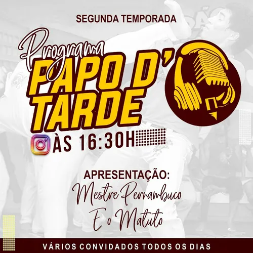"PAPODTARDE - O programa que vai animar suas manhãs e tardes! 🎙️💬 De domingo a domingo, trazemos entrevistas, vídeos, debates e muita informação sobre os mais variados eventos de Capoeira. Nossa equipe de produção juntos com o Mestre Pernambuco, recebem convidados especiais para falar sobre eventos, aulas, cultura, entretenimento e muito mais. Siga nosso perfil e fique por dentro de tudo o que rola no programa. Não perca um só episódio! 📺🍿" Destacamos que nossa programa, como o horário de exibição das live, sempre as 16h30, os temas abordados e os apresentadores totalmentecompromissadoscom a arte capoeira. Curta, inscreva-se e acompanhem nosso perfil e siga no Instagram @mestre_pernambuco e assistir aos episódios aqui no YouTube 📺🍿
