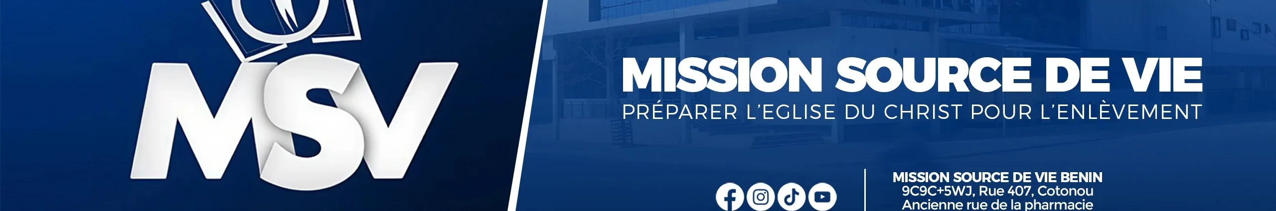 La Mission Source de Vie (MSV) est une église qui œuvre à préparer l'épouse de Jésus-Christ (l'église) à l'enlèvement (son retour). La communauté MSV se réunis en présentiel au Bénin sur trois sites Sikècodji-Cotonou, Akpakpa-Cotonou et Sékou. Le Révérend Pasteur Camille TOHOUBI, en est le pasteur principal. La Mission Source de Vie diffuse son culte en direct tous les dimanches à 08h30. Retrouvez gratuitement l'ensemble des messages MSV, sur nos différentes plateformes.