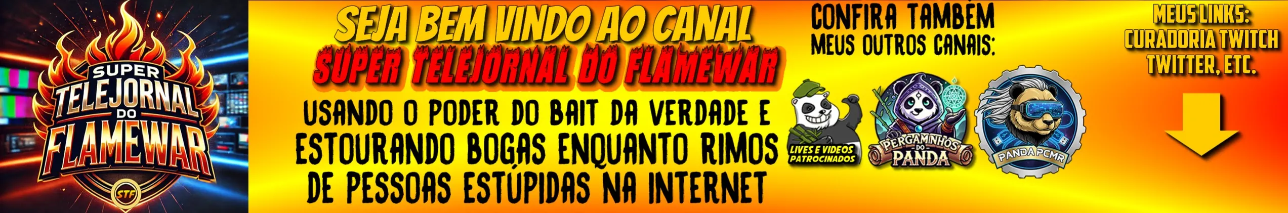 #flame #flamewar #treta #drama #colapso #peoplewar #stf Sejam bem vindos ao canal que mais causa colapsos no flame nacional (e internacional) O SUPER TELEJORNAL DO FLAME Esse canal surgiu como um nexus de todo o Flamewar Nacional, para drenar e catalisar todo o dinheirismo, vilipêndios, zoeiras e principalmente rir de gente estúpida na Internet, enquanto ganho dinheiro e tiro o donate dessa galera, é um plano simples que já rendeu muitos frutos! Se é sua primeira vez aqui, seja muito bem vindo e espero que você curta bastante o conteúdo, porque eu, com certeza, adoro faze-lo ;) OBVIAMENTE VEDADO O REACT EM TEMPO REAL, SE FIZER ISSO O STRIKE VAI COMER SOLTO (REACTS DE CONTEÚDO GRAVADO SÃO LIBERADOS (MEDIANTE PAGAMENTO DO MEMBRO DO CANAL) meus outros canais: Canal focado em Jogos ► https://bit.ly/Pergaminhos Canal PCMR (Vlog) ► https://www.youtube.com/c/cguiao Canal de Espiadinhas Patrocinadas ►https://bit.ly/pandadosgames http://twitch.tv/pandadosgames https://x.com/pandadosgames