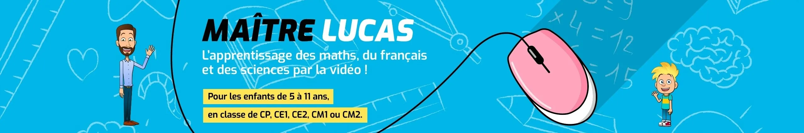 Maître Lucas vous proposera des vidéos éducatives à destination de vos enfants âgés de 5 à 11 ans et évoluant en CP, CE1, CE2, CM1 ou CM2. Créées sous forme d'animations ludiques, ces vidéos éducatives pourront être utilisées à titre de révision ou en compléments des cours de Cycle 2 et Cycle 3. Elles couvriront des matières telles que les mathématiques, les sciences, le système solaire, la grammaire, l'orthographe, la conjugaison et plus largement la découverte du monde. Outre les divisions, les soustractions, les additions, la germination… Maître Lucas contera à vos enfants grâce à différentes histoires animées. Vous y trouverez également des jeux et exercices à la suite de certaines vidéos afin de compléter l'apprentissage. Professeur des écoles passionné dans des classes de CP, CE1, CE2, CM1 et CM2, Maître Lucas offrira à vos enfants une manière ludique de réviser ou compléter leur apprentissage de l'école primaire.