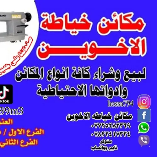 محلات الاخوين👬 لبيع وشراء. وتبديل مكائنكم القديمه مع الجديد وصيانه 🛠️🔧 كافة مكائن الخياطه🎌اليابانيه مع الضمان💯 الحقيقي لمده سنه كامله الحلو👍 بالعمل ليس توصيل فقط محلاتنه معروفه في بغداد وعدنه توصيل🚗 لكل المحافظات جميع المكائن💡 متوفره منزليه وصناعيه واوفرات ومكائن التطريز للحجز او الاستفسار الاتصال📞 او مراسلت الواتساب فايبر 07725283369/ 07822417334 عنوانه مدينه الصدر