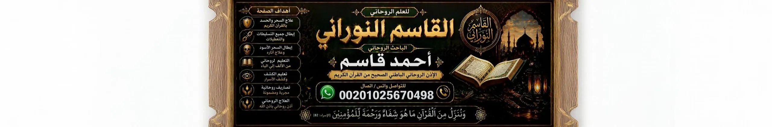 التواصل من خلال الارقام الآتية ✅✅ 00201025670498 هاتف فقط ✅✅ ✅✅ 00201055237456 هاتف فقط ✅✅ أخوكم في الله أحمد قاسم باحث في العلم الروحاني من القرآن الكريم معالج بالرقية الشرعية تعليم الاوراد والاذن الروحاني الباطني من القران الكريم تعليم الكشف الباطني بشكل صحيح وامن بعيدا عن الدجل والشعوذه قناة القاسم النوراني للعلم الروحاني تقديم رقية شرعية وأذكار قرآنية والتوعية بمفاهيم خاطئة منتشرة وكل ما يُقدَّم هو اجتهاد شخصي من القرآن والسنة بعيدًا عن الدجل والشعوذة وتصحيح المفاهيم الخاطئه في المجال العلم الروحاني الرابط الوحيد للصفحة العامه علي الفيس بوك 🇾🇪👌🇾🇪👌🇾🇪 https://www.facebook.com/AhmedKassem111 رابط مجموعه القاسم النوراني للعلم الروحاني 🇾🇪👌🇾🇪👌 https://www.facebook.com/groups/1718621768268929/?ref=share ♥️#القاسم_النوراني_للعلم_الروحاني♥️ ✅الباحث_الروحاني_احمد_قاسم✅ وحدوا الله ❤️ استغفروا الله ❤️صلوا على رسول الله❤️ اللهم صلي وسلم وبارك على سيدنا محمد سر الله الاعظم