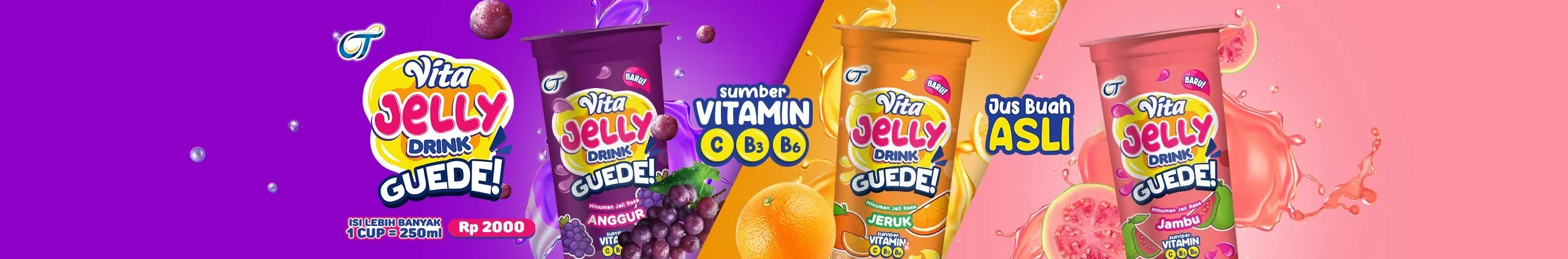 Vita Jelly adalah minuman jeli segar yang dapat menganjal lapar dan bikin mood lagi. Dengan jus buah asli serta kandungan Vitamin C, B3, dan B6 yang menyehatkan. Vita Jelly tersedia dalam 4 macam varian, yaitu: Stroberi 🍓 , Jeruk 🍊 , Anggur 🍇 , dan Jambu 🍐.
