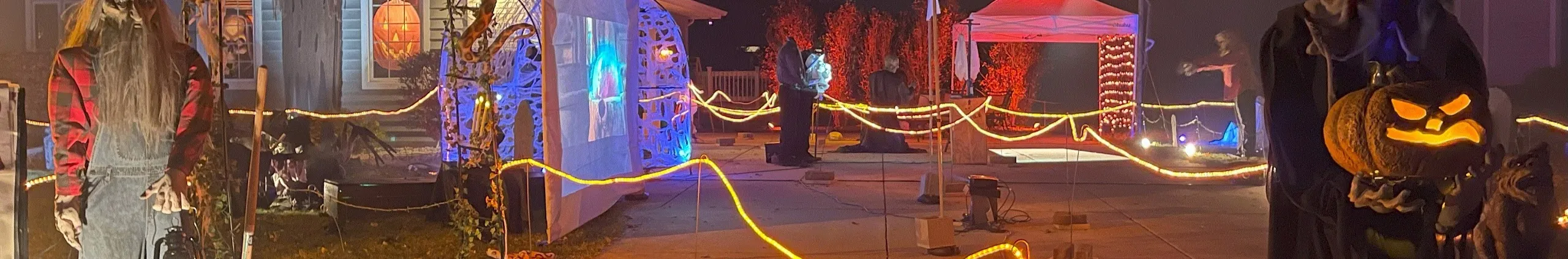 We have been Halloween home haunting for over 24years now. On Halloween night, our front yard transforms into a haunted graveyard with over 50 animated Halloween decorations. These props are homemade by me, (many are pneumatic) or they are designed by me and manufactured and sold in stores. The graveyard has expanded over the years and now stretches over the entire front yard. Trick or Treaters walk past the haunted graveyard on their journey to the front door and they “earn” their candy if they make it through. Since Covid, we made changes. We split our driveway down the middle, and now the journey is up the driveway, into the garage and then down the other side of the driveway. A necessary change to allow people space. We can now see the entire haunt from our spot at the top of the driveway. Instagram: @halloween_home_haunt