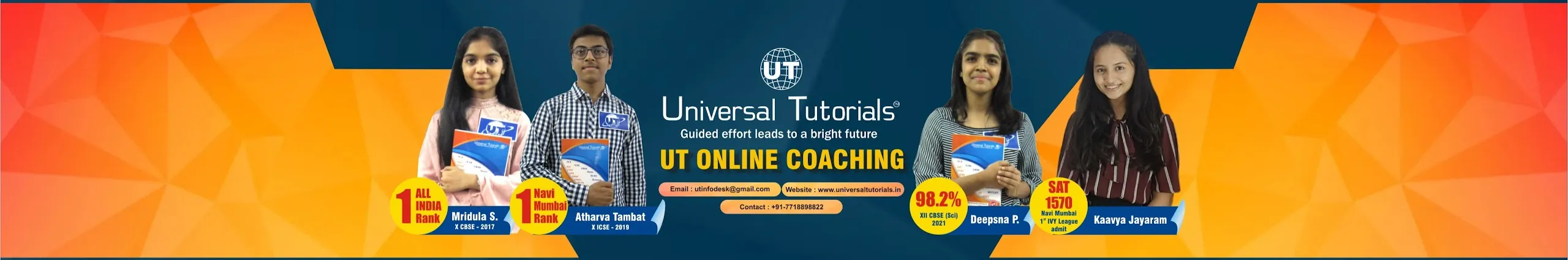 *Universal Tutorials* (UT) provides (Classroom & Online) coaching for IX, X CBSE & ICSE, IIT/NEET, Study Abroad (SAT, TOEFL, IELTS, GRE, GMAT), IPM, CLAT. UT was establish in *1998* and since then it has taught more than *35,000 students* all across Navi Mumbai. *For any further query please feel free to contact us*. *7718898822*