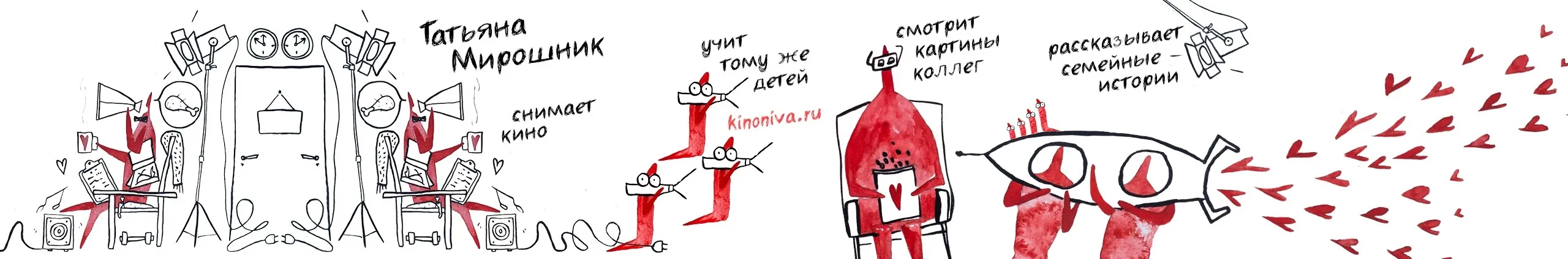 Меня зовут Татьяна Мирошник. Я сценарист, режиссер, продюсер и педагог. На этом канале фильмы, к которым я имею отношение. Но не все) Сценарист художественных фильмов «Рябиновый вальс», «Виртуальный роман», «Флэшмоб» и «Клятва», сериалов «Служба 21» и «Конец света». Автор сценария и режиссер сериалов «Встречная полоса» и «Аромат шиповника». Автор сценария и креативный продюсер трилогии «Частное пионерское». Сценарист и режиссер документальных фильмов – «Посланник патриарха», «Солдаты наши меньшие», «Повелитель стихий», «Животные рядом со Святыми», «Артековский закал», «Крымский лекарь», «Жить дружно», «Федор Конюхов рисует…», «Я и Кино». Закончены съемки фильма «Слёзы дракона» (рабочее название «Коралловые бусы»). На этом проекте я сценарист, режиссер и сопродюсер. Веду блоги ДЕТСКОЕ И ЮНОШЕСКОЕ КИНО в ТГ, ФБ и ВК Руководитель Детской студии КиноНива http://kinoniva.ru Студия существует с 2016 года и в её рамках снято более 150 детских короткометражных фильмов.