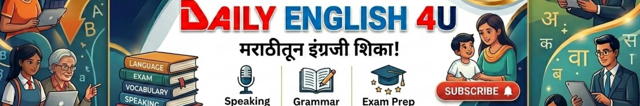 Daily English 4u या चॅनेल वर तुमचे स्वागत आहे. जिथे इंग्रजी मराठीत शिकवले जाते. दररोज इंग्लिश बोलण्यासाठी आवश्यक English Vocabulary चा वापर विविध Sentences मध्ये समजावून सांगितले जाते.तुमचा सराव पण आम्ही घेतो. इंग्लिश वाक्यरचना करून इंग्लिश बोलणे देखील आम्ही शिकवितो. इंग्लिश बोलण्यासाठी आवश्यक बेसिक टिप्स आम्ही शेअर करतो. इंग्लिश बोलण्यासाठी आवश्यक बेसिक ग्रामर आम्ही सहजपणे शिकवितो. बेसिक इंग्लिश स्पिकिंग कोर्स तसेच अडवान्स इंग्लिश स्पिकिंग कोर्स या Channel वे तुम्हाला शिकायला मिळेल. प्रत्येक दोन दिवसाला व्हिडीओ या ठिकाणी तुम्हाला मिळतील. चला तर मग इंग्लिश अस्खलितपणे बोलण्यासाठी आजच Daily English 4u Channel Join करा. Through this channel you would learn English Through Marathi. Our English lessons are easy to understand and follow. This channel offers you vocabulary practice with examples , Spoken English Basic And Advance Course, English Grammar, Fluent English Practice as like native speaker. So Subscribe now for daily updates! https://www.youtube.com/c/DailyEnglish4u