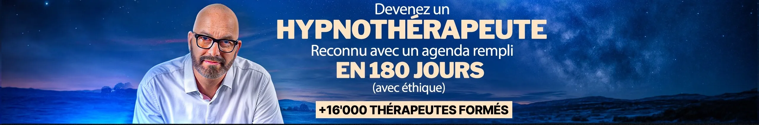 Devenez un hypnothérapeute reconnu et remplissez votre agenda en 180 jours avec éthique. Je suis Frédéric BARBEY, Fondateur et Formateur principal de l'École Francilienne d'Hypnose (EFH) et expert en accompagnement des entrepreneurs du bien-être pour le lancement de leur cabinet. Je suis auteur de nombreux livres chez Larousse, Leduc et Suzac et conférencier. Ma mission est d'accompagner les passionnés du bien-être à devenir un hynothérapeute reconnu et rentable en seulement 180 jours, même en partant de zéro. Je vous donne la méthode, jusqu'à votre certification et la réussite de votre cabinet.