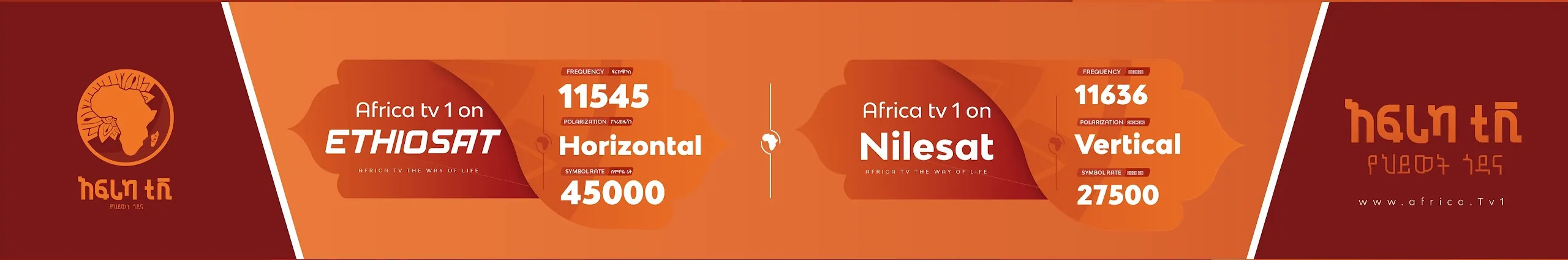 አፍሪካ ቲቪ1 ኢትዮጵያ ውስጥ በሚገኙ አገር በቀል ቋንቋዎች በሸሪዓ ይዘት የተቃኙ አስተማሪ እና ቁምነገር የሚያስጨብጡ ፕሮግራሞችን እያዘጋጀ የሚያቀርብ አንጋፋና ቀዳሚ የቴሌቭዥን ጣቢያ ነው ። ዋና አላማው የሆነውን ለሚሊዮኖች የሕይወት ጎዳና መቃናት ሰበብ ለመሆን በትጋት እየሰራ ይገኛል ። በናይል ሳይት (Nilesat) በ 11636 V 27500 ፍሪኩዌንሲ በ ኢትዮሳት (Ethiosat) ደግሞ በ 11545 H 45000 ፍሪኩዌንሲ በኩል መመልከት ይችላሉ ። በማህበራዊ ሚዲያ ገጾቹ በኩል ለመከታተል ከታች ያሉትን መስፈንጠሪያዎችን ይጠቀሙ። * ፌስቡክ: [facebook.com/AfricaTVCh1](https://www.google.com/search?q=https://facebook.com/AfricaTVCh1) * ቴሌግራም: t.me/africatv1 * ዩቲዩብ: [youtube.com/AfricaTV1](https://youtube.com/AfricaTV1) * ኢንስታግራም: [instagram.com/africatvch1](https://www.google.com/search?q=https://instagram.com/africatvch1) * ድረ-ገጽ: www.africatv1.tv