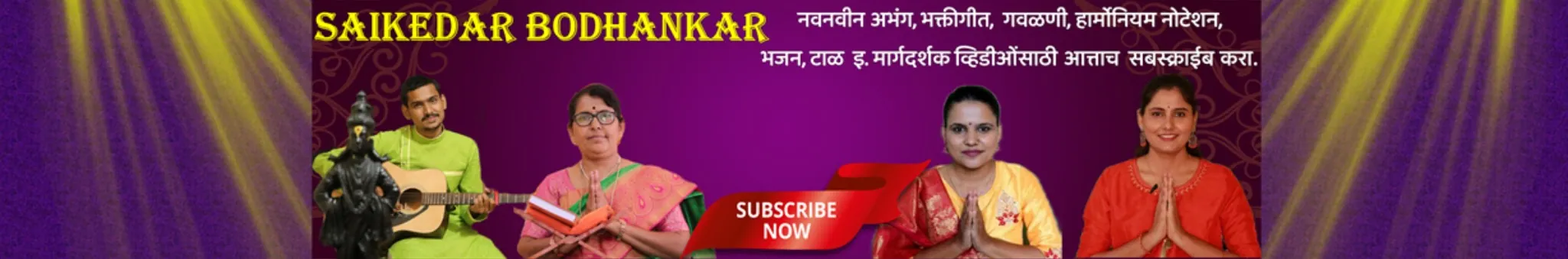 नमस्कार!! साईकेदार बोधनकर या चॅनल मध्ये आपले स्वागत आहे. या चॅनल वरून आम्ही आमच्या परिवारातील सर्व सदस्यांचे गाण्याचे व्हिडिओ जसे भक्तीगीत, भावगीत, मंगलाष्टक, अभंग, गौळण इत्यादी. त्याचप्रमाणे विविध मार्गदर्शक व्हिडिओ जसे टाळ , हार्मोनियम नोटेशन, गाण्याबद्दल , भजनाबद्दल मार्गदर्शक व्हिडिओ तसेच हिंदी , मराठी कराओके , Guitar Cover songs आम्ही आपल्या सर्वांसाठी सादर करत आहोत. आमचे व्हिडीओ आवडल्यास लाईक, कमेंट करा आणि आमच्या चॅनल ला सबस्क्राईब करायला विसरू नका. Contact - Ankita Bodhankar- kakde 9850292677